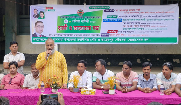অনুষ্ঠিত আলোচনা সভায় উপজেলা সেচ্ছাসেবক দলের ভারপ্রাপ্ত আহবায়ক রাজু আহম্মেদের সভাপতিত্বে ও উপজেলা সেচ্ছাসেবক দলের ভারপ্রাপ্ত সদস্য সচিব মেহেদী হাসান টিপুর সঞ্চালনায় প্রধান অতিথি হিসেবে বক্তব্য রাখেন, ডাঃ আশফাকুর রহমান শেলী সহ স্বাস্থ্য বিষয়ক সম্পাদক, কেন্দ্রীয় কমিটি, জাতীয়তাবাদী সেচ্ছাসেবক দল, প্রধান বক্তা হিসেবে বক্তব্য রাখেন, শাহরিয়ার আমিন বিপুল, সদস্য সচিব রাজশাহী জেলা সেচ্ছাসেবক দল, প্রধান পৃষ্টপোষক হিসেবে বক্তব্য রাখেন, সাইদুল ইসলাম গাজী, আহবায়ক ভবানীগঞ্জ পৌর সেচ্ছাসেবক দল ও ডি এম শাহীন সদস্য সচিব, ভবানীগঞ্জ পৌর সেচ্ছাসেবক দল, জাহাঙ্গীর আলম আহবায়ক, তাহেরপুর পৌরসভা ও আশরাফুল ইসলাম, সদস্য সচিব, তাহেরপুর পৌরসভা সেচ্ছাসেবক দল, রুহুল আলম সনি, যুগ্ম আহবায়ক, বাগমারা উপজেলা সেচ্ছাসেবক দল প্রমুখ। অনুষ্ঠান শেষে একটি বর্ণাঢ্য র্যালী বের করে উপজেলার প্রধান প্রধান রাস্তা প্রদক্ষিন করেন।